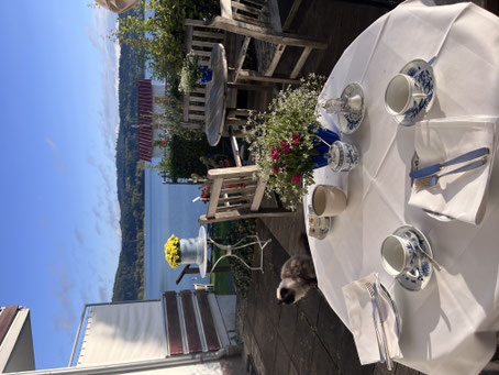 Genießen Sie unser Frühstück bei gepflegtem Ambiente mit vornehmem Tafelservice in unserem Frühstücksraum oder bei Sonnenschein im Garten mit Blick auf den Bodensee.